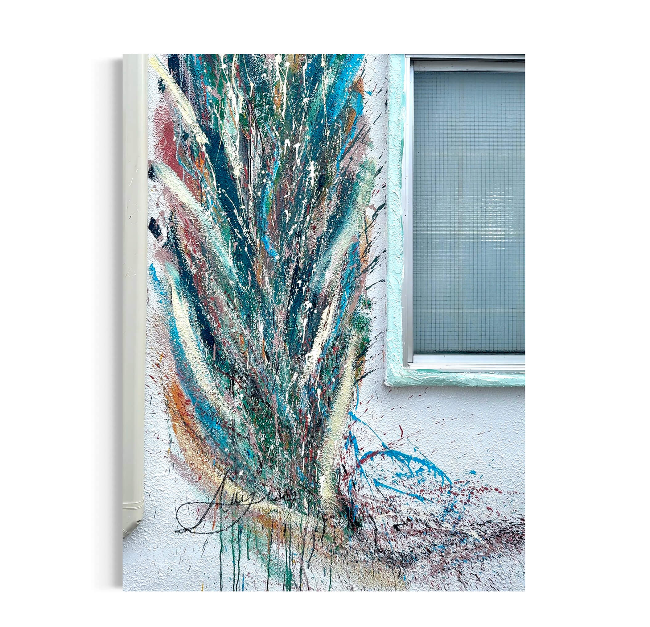 お客様の店舗の外装を「羽」にちなんで、自由な発想で描いた作品。近くで見ると抽象的な色や線の重なりが見え、離れて眺めると羽の形が浮かび上がる。訪れる人の記憶に刻まれる景色の一部となるように。